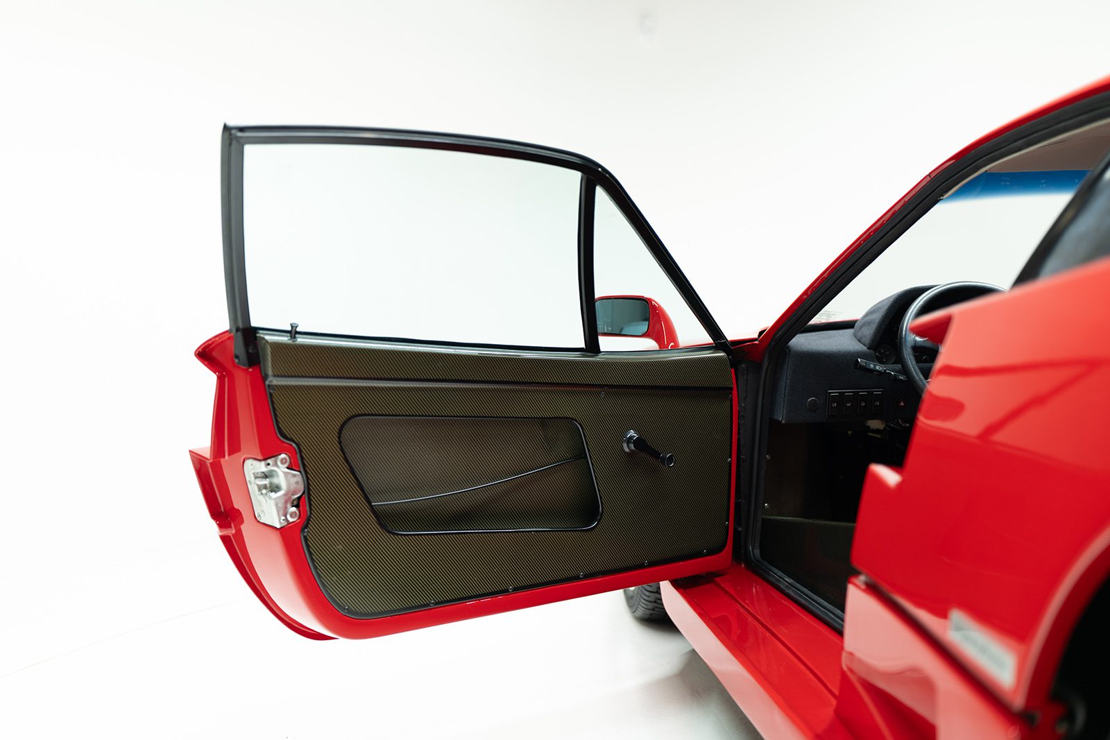 Der Innenraum ist funktional, fast spartanisch – mit sichtbarem Carbon, rotem Teppichboden und ikonischen Schalensitzen.