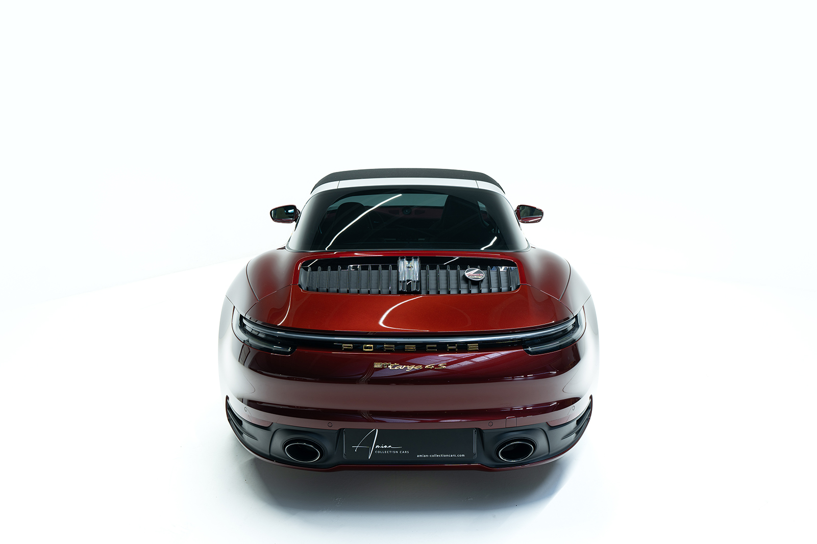 Die Heritage Design Edition wurde von der Porsche Exclusive Manufaktur entwickelt und greift bewusst Gestaltungselemente der 1950er- und frühen 1960er-Jahre auf. Die ikonische Lackierung in Kirschrot Metallic erinnert an eine der populärsten Porsche-Farben dieser Ära und unterstreicht die klassische Linienführung der Targa-Karosserie. Goldfarbene Schriftzüge, historisch inspirierte Embleme sowie das originale Porsche-Wappen im Stil von 1963 schaffen eine authentische Verbindung zur Markenhistorie. Charakteristische Designelemente wie die weißen Motorsport-Startnummernfelder auf den Türen, exklusive 20/21-Zoll Carrera Exclusive Design Räder und der markante Targa-Bügel im klassischen Metall-Look verleihen dem Fahrzeug eine unverwechselbare Präsenz.